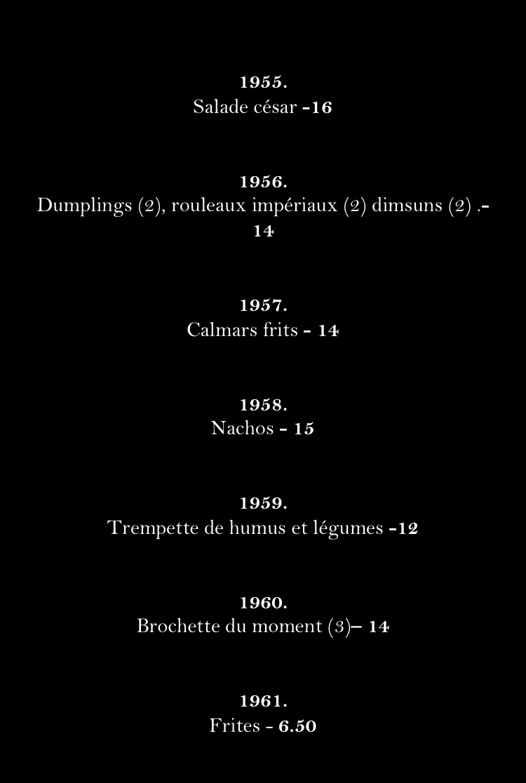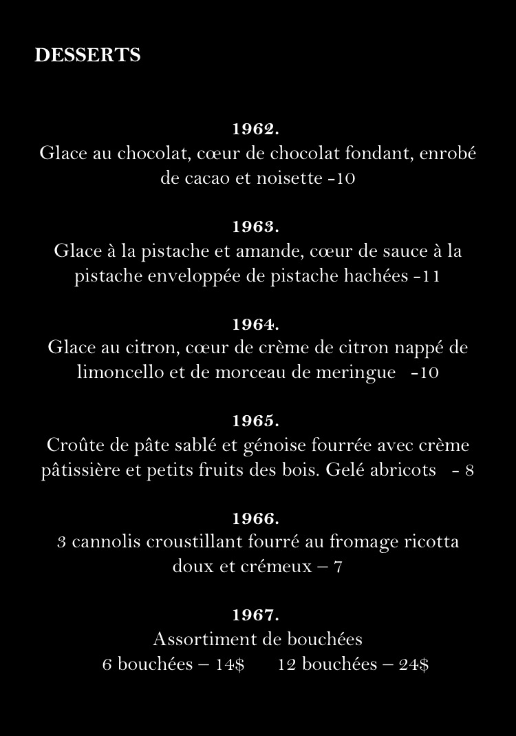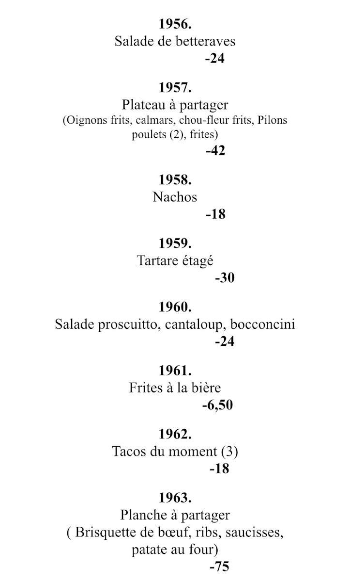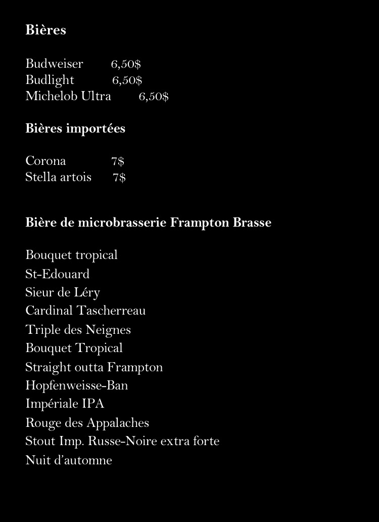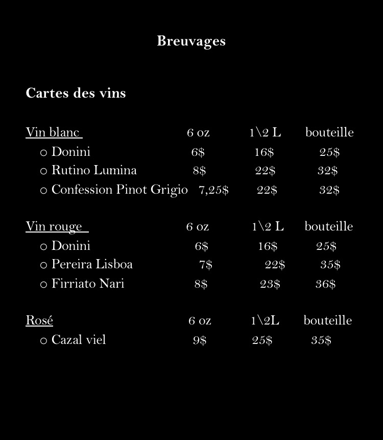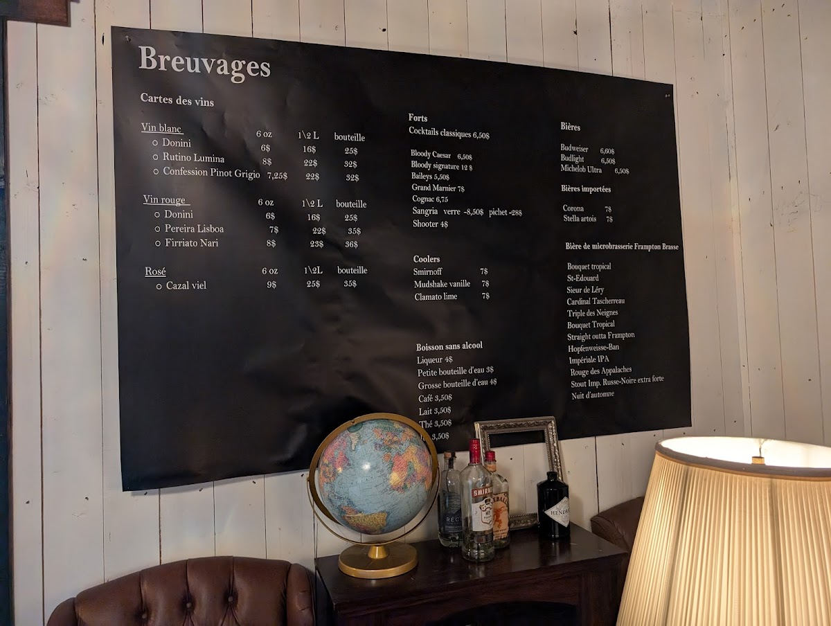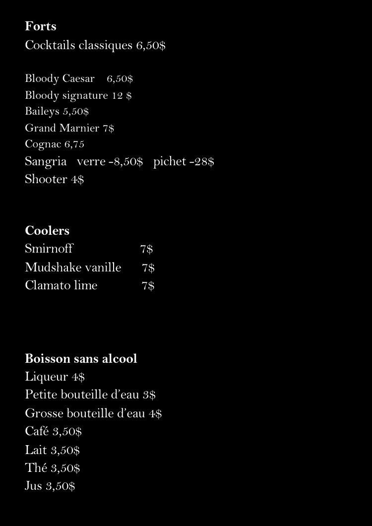 From a reviewer’s perspective, the menu at Restaurant La Vieille Tablée Vintage 1950 offers a concise but enjoyable selection of beverages that nicely complements the restaurant’s vintage atmosphere. The stronger drink options include Baileys, Grand Marnier, Cognac, Sangria, and Shooter, providing a good range for guests who prefer classic spirits and after-dinner drinks. For something more refreshing, the cooler selection such as Smirnoff, Mudshake Vanille, and Clamato Lime adds a lighter, more casual touch to the menu. Non-alcoholic options are also available, including Café, Jus, Liqueur, Petite Bouteille D'eau, and Grosse Bouteille D'eau, ensuring that all guests have suitable choices. Overall, while the menu is not overly extensive, the drink names reflect a balanced selection that fits well with the restaurant’s nostalgic theme and provides enough variety to satisfy different tastes.